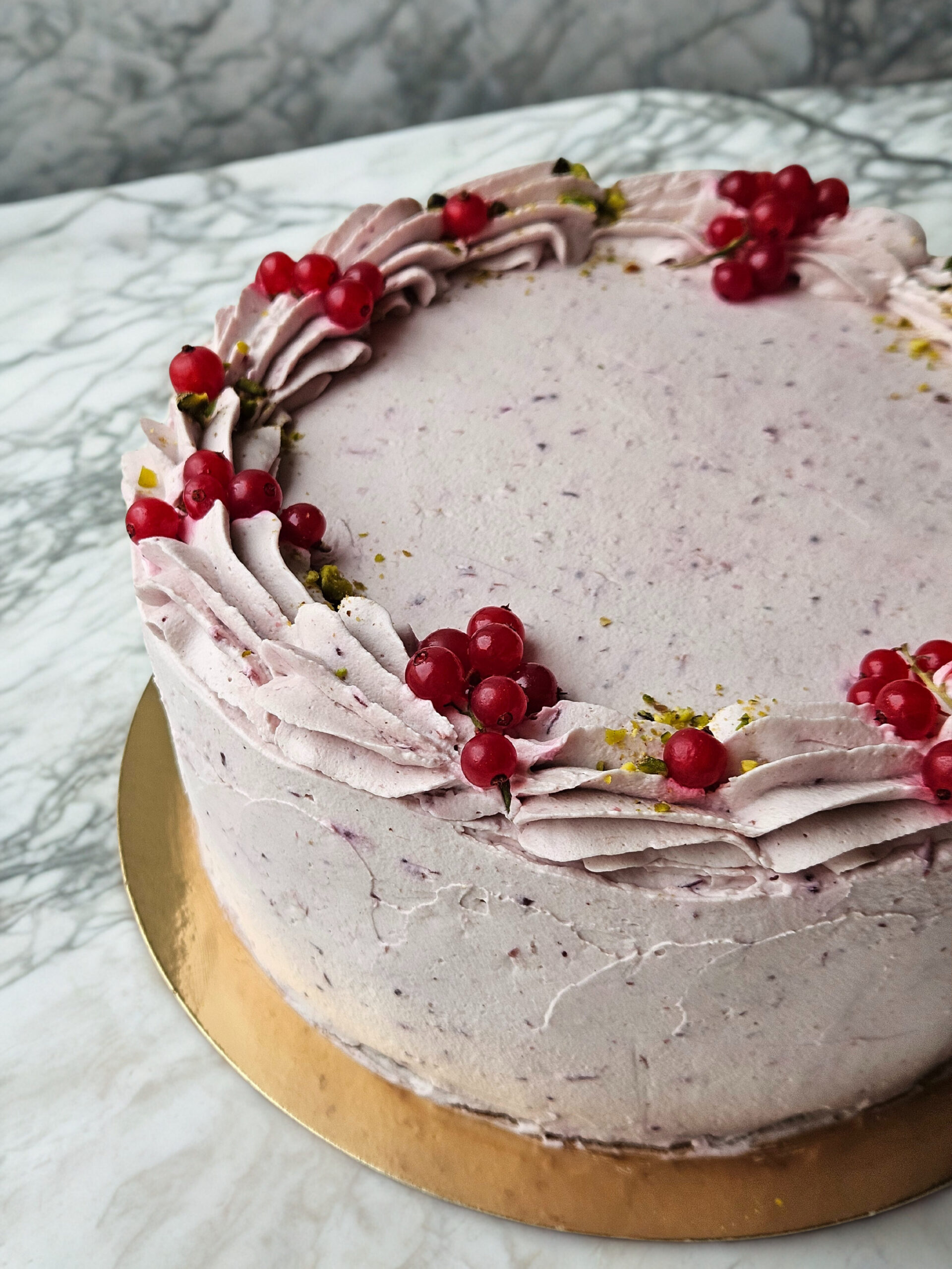 Rohelise ja punase värvikombo on küll jõuluteemaline, kuid see tort sobib söömiseks aasta ringi. Magus pistaatsiahõnguline biskviit, hapukas jõhvikamoos ning jõhvikast roosaks värvunud siidine India pähkli baasil valmistatud kreem moodustavad ühe väga luksusliku ampsu.