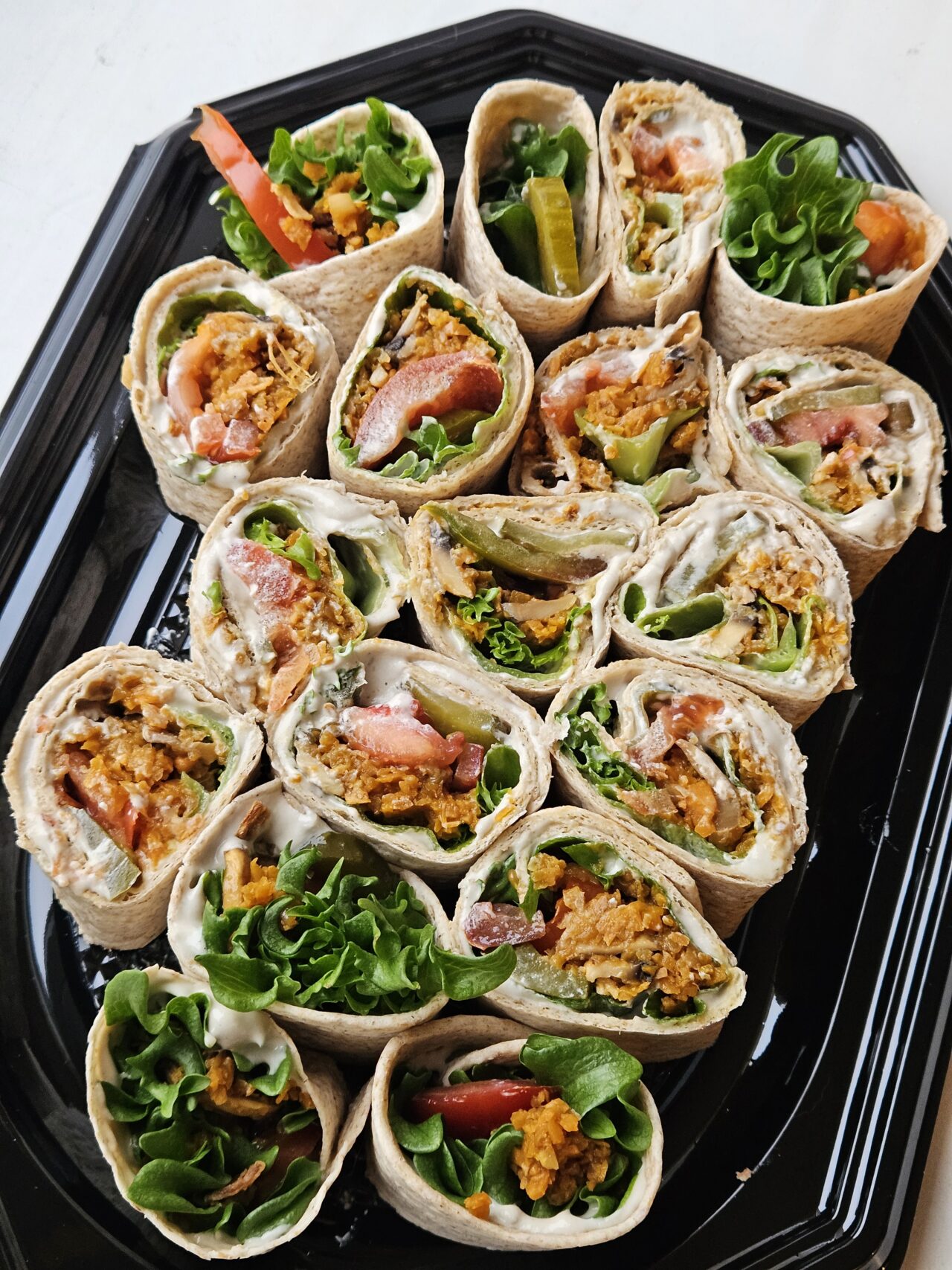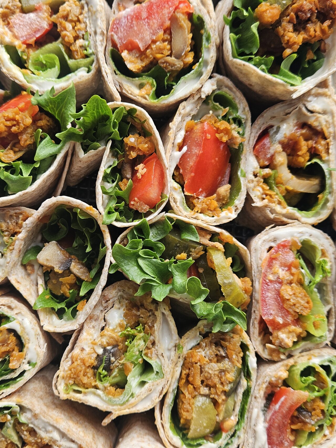 Täisteratortilja (täisteranisujahu), bataat, tomat, India pähklid, sibul, šampinjonid, lehtsalat, marineeritud kurk, sojakaste, päevalilleseemned, vedel suitsuekstrakt, küüslauk, maitsepärm, valge veini äädikas, oliiviõli, Himaalaja sool, pipar, sibulahelbed
