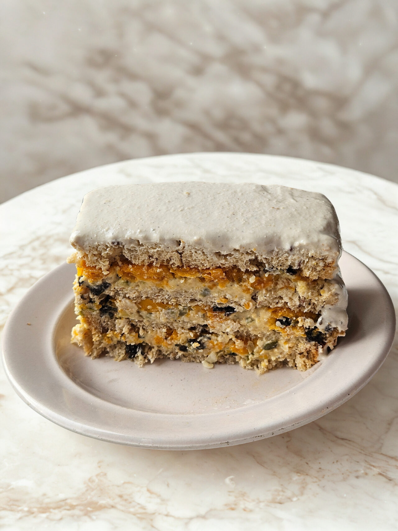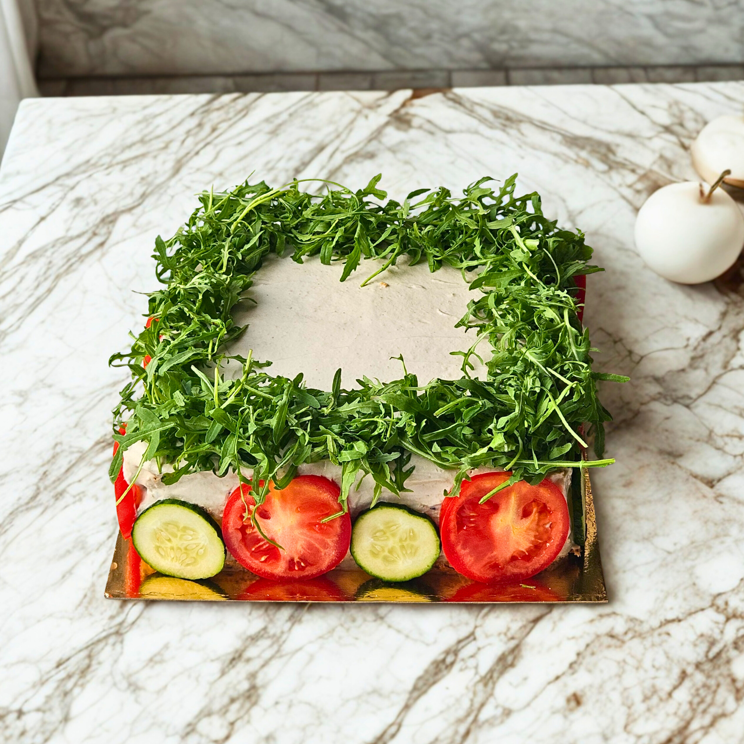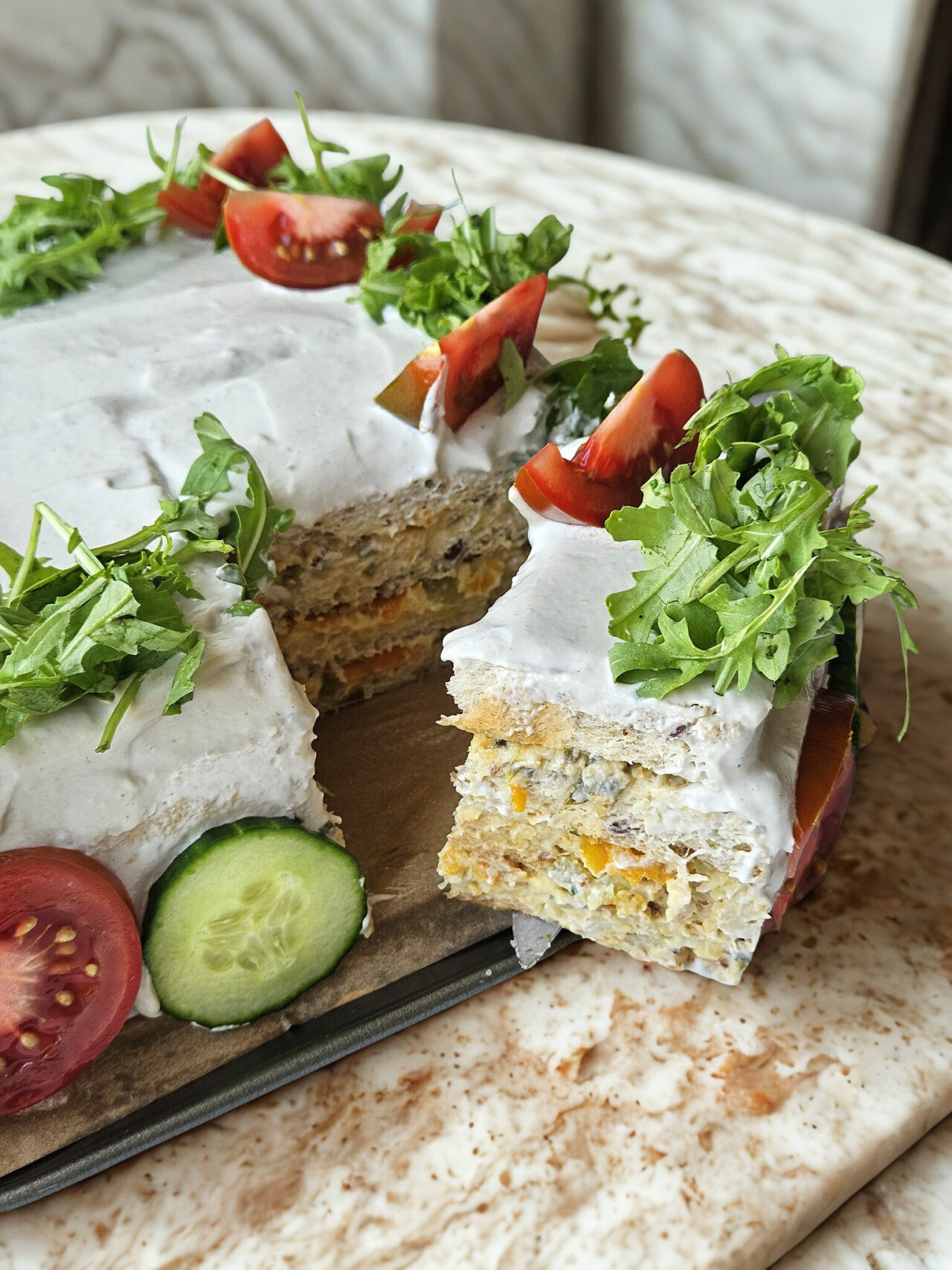 Võileivatordi vahel on kreemine kikerhernestest valmistatud „tuna“, mille maitse on rikkalik ja mereline, meenutades tuunikala, kuid olles täiesti taimne. Lisaks annab käsitööna valminud õrnalt suitsutatud porgand täidisele sügavust ja mõnusat tekstuuri. Tordi katteks on siidine India pähkli kreem, mis seob kõik maitsed täiuslikult kokku ja loob luksusliku viimistluse. Värskust toovad tomat, kurk ja rukola.